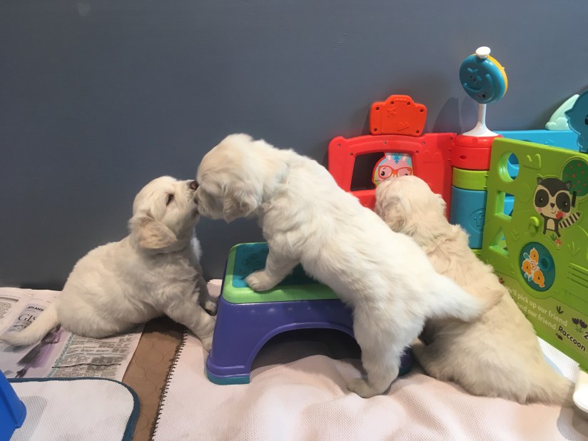 Owners must take into account that their golden retriever puppy is a developing large breed dog. Large breed puppies’ bodies are growing at a fast pace and it is very easy for them to hurt their developing joints and growth plates by too much exercise, too much stop and start play, overly aggressive play, hard surfaces, and jumping up and down onto high surfaces. Stairclimbing, mountain trails, excessive climbing should be avoided as well as jogging or running a puppy. Please do not let your puppy jump off of any high surfaces.