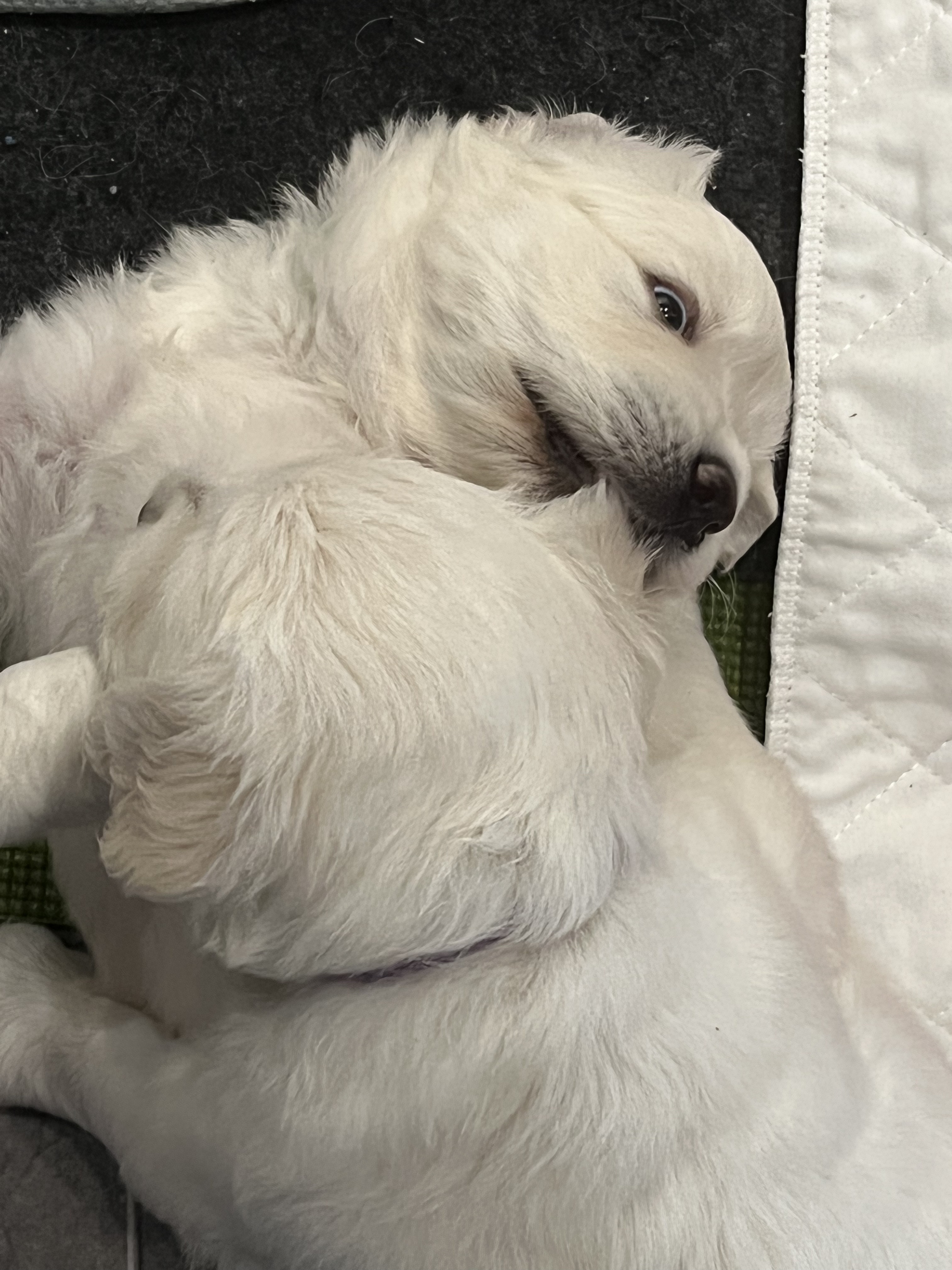 We are just beginning to hold a toy with our paws. We can climb, walk on a wood floor with some sliding, we can run in the grass, we are learning to go into our crate for rest time. We are busy bees when we are awake but we still need LOTS of sleep! Growing is hard work! We are eating a little bit of puppy cereal and working on weaning from our mommy.