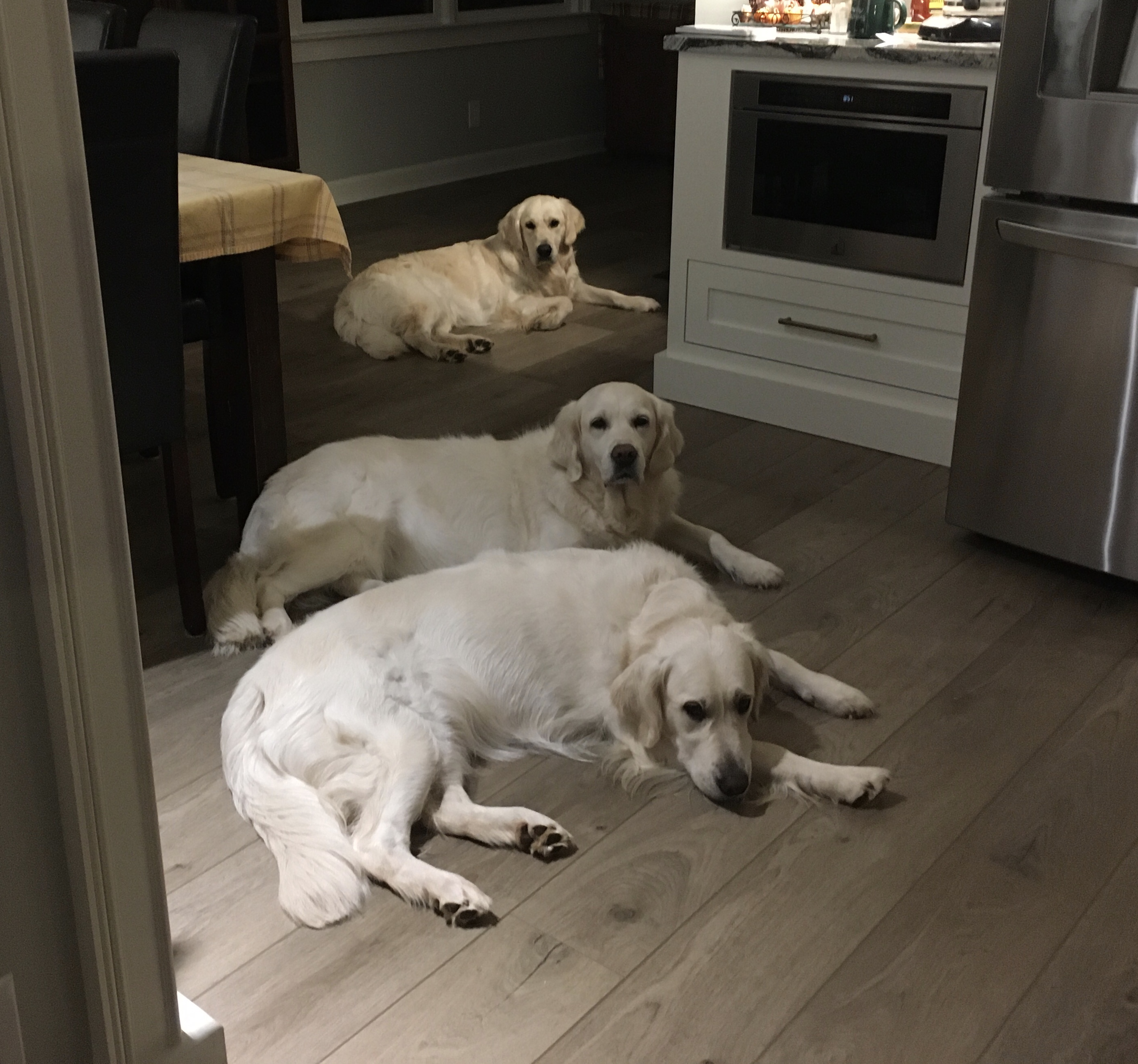 Just hanging out with our peeps in the kitchen! Leia is background, Lilly in the middle, Gemma up front.